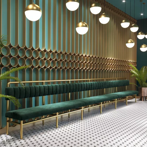 Manhattan Bench is a modular dining bench built with a sleek powder-coated steel frame and high-density foam for superior comfort and durability. Fully customizable with a wide selection of professional fabrics, this bench can be tailored to any hospitality concept.