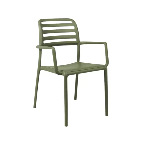 Costa este un scaun de exterior modern, cu cotiere, realizat din polipropilenă ranforsată cu fibră de sticlă și aditivi UV. Spătarul cu lamele și cadrul curbat fără îmbinări oferă confort și stil. Ușor, practic și stivuibil.