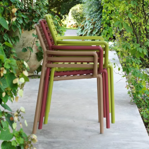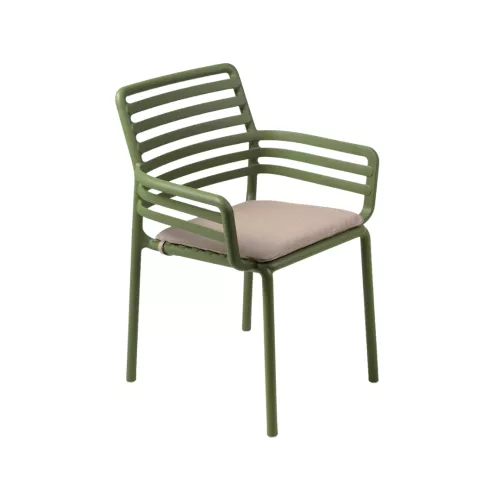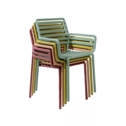 Doga A este un scaun monobloc cu brațe, conceput pentru confort și eleganță. Fabricat din rășină de polipropilenă ranforsată cu fibră de sticlă, colorată uniform și cu aditivi UV, scaunul este durabil, rezistent la intemperii și reciclabil. Are un finisaj mat, picioare antiderapante și este stivuibil pentru o depozitare ușoară. Disponibil într-o gamă variată de culori: alb, antracit, cappuccino, mentă, agave, pară, marsala și tutun. Pernă disponibilă la comandă.