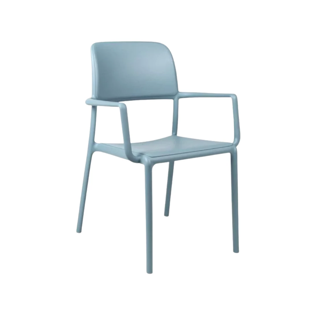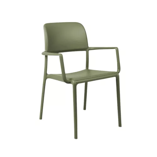 Riva este un scaun monobloc rezistent, cu brațe, realizat din polipropilenă cu fibră de sticlă, colorată uniform și cu aditivi UV. Are finisaj mat, este reciclabil și potrivit pentru orice terasă HORECA.